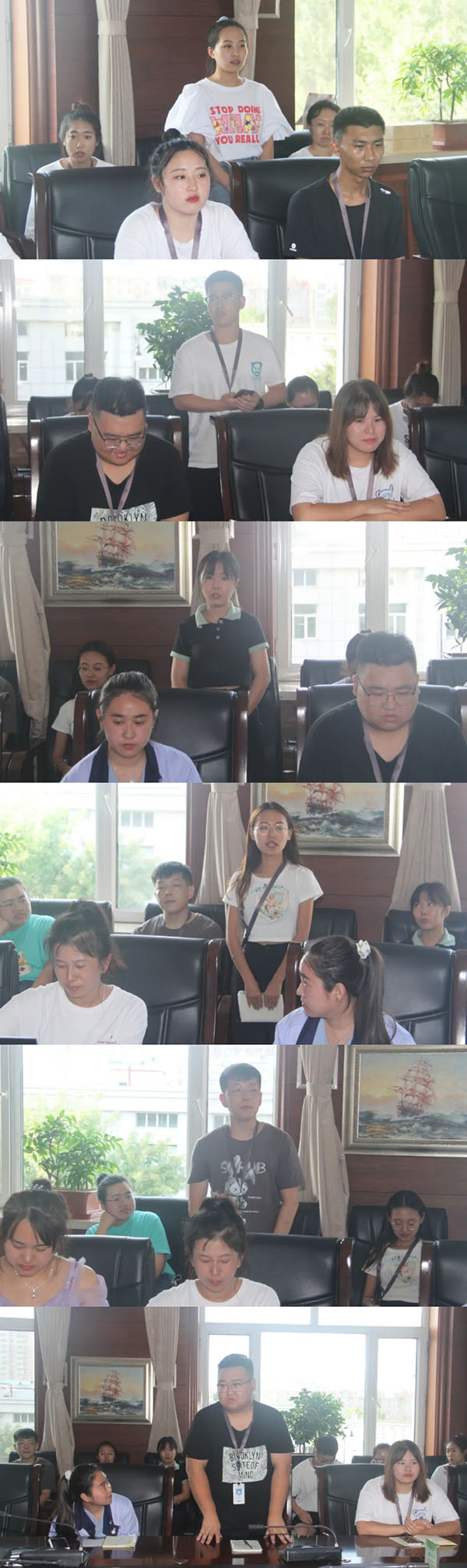 會議首先傳達了方同華董事長和陳??偛迷诖髮W生座談會上的講話文件,大學生們認真聆聽、記錄,領會精神。隨后,上一屆入職公司的大學生鐘方卓、王笑穎,作為老學員代表進行了發(fā)言。她們暢談了這一年來在公司的經歷和體會,感受最深的就是公司的和諧、友愛、務實、奮進;她們鼓勵新學員敞開心扉,擺正姿態(tài),潛心鉆研業(yè)務,努力提升自我。大學生們依次作了自我介紹,并將自己今后的職業(yè)發(fā)展方向和規(guī)劃與公司領導進行了交流,各系統(tǒng)、部門、車間負責人也對大學生們提出了希望和要求。